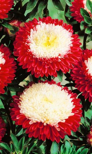 Прекрасная двухцветная астра с помпонными соцветиями Ø7-9 см. Кусты компактные, колонновидные, прочные, высотой 50-60 см, за период вегетации формируют 25-30 соцветий на длинных цветоносах. Цветение раннее и продолжительное, с июля до глубокой осени. Астры холодостойкие, светолюбивые (но выносят полутень), не любят сырых, переувлажненных почв. Широко используются для оформления клумб, бордюров и цветников. Отлично подходят для срезки, цветы стоят в воде до двух недель...