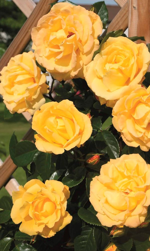 Сорт характеризуется очень длинными побегами и невероятно крупными, диаметром 12-14 см, цветками. Сочный жёлтый цвет, приобретающий мягкие, лимонные оттенки по краям лепестков, делает розу незаменимым украшением роскошного сада. Цветки открываются очень медленно и...