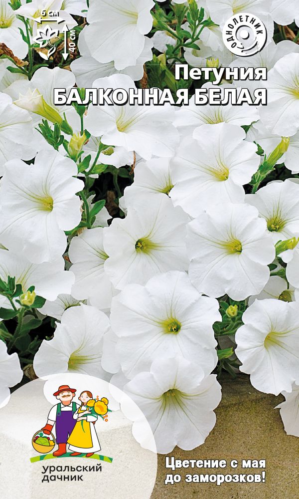 Ампельная обильноцветущая петуния. Стебли свисающие, гибкие, длиной 35-40 см, равномерно усыпаны огромным количеством белоснежных цветков Ø6-8 см. Цветение раннее и продолжительное, с мая до окончания сезона. Растения прочные, хорошо переносят воздействие дождя и ветра, не теряя своей декоративности. Петуния светолюбива, засухоустойчива, хорошо адаптируется к любым условиям выращивания. Идеально подходит для выращивания в подвесных корзинах, кашпо и балконных ящиках.