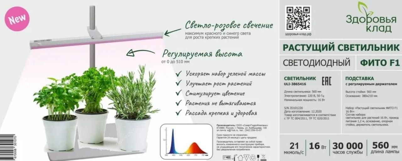 Фитосветильник «Здоровья клад» сине-красного спектра предназначен для выращивания зелени, рассады паслёновых, а также для досвечивания комнатных цветов. Прибор излучает комфортный для глаз человека свет, поэтому его можно использовать в жилых помещениях.
